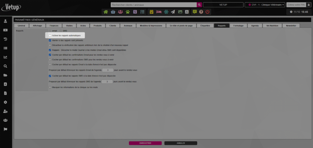 Depuis PARAMETRES > Paramètres Généraux > Rappels > Cochez ou décochez la case Activer les rappels automatiques. Puis enregistrez.