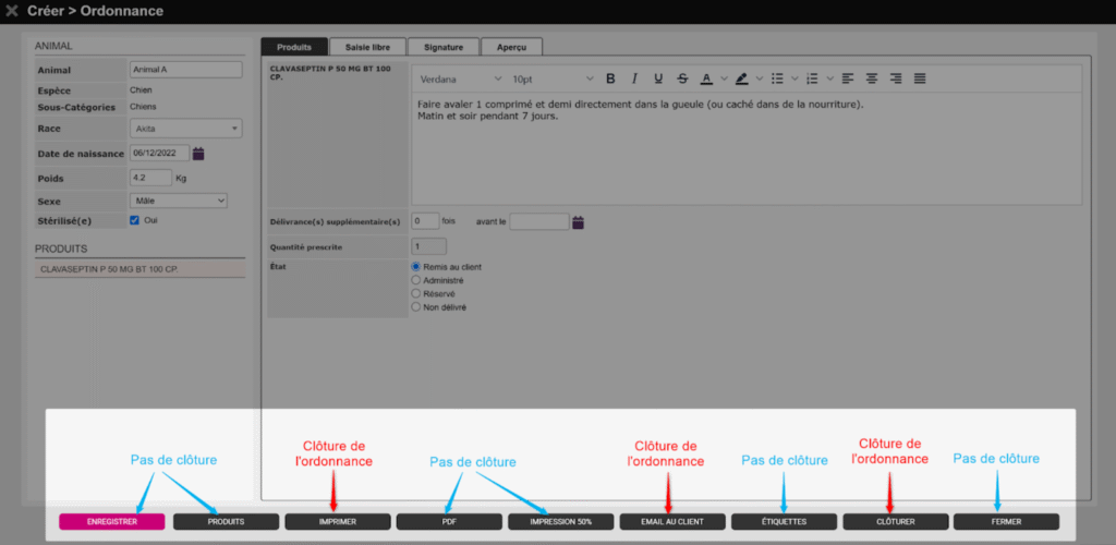 ⚠️ La clôture est définitive : une fois l’action validée, aucun retour en arrière n’est possible et il n’existe aucun moyen de rouvrir ou de corriger le document. Il est donc essentiel de vérifier attentivement, en concertation avec le propriétaire de l’animal si besoin, que toutes les informations sont correctes avant de clôturer une ordonnance.