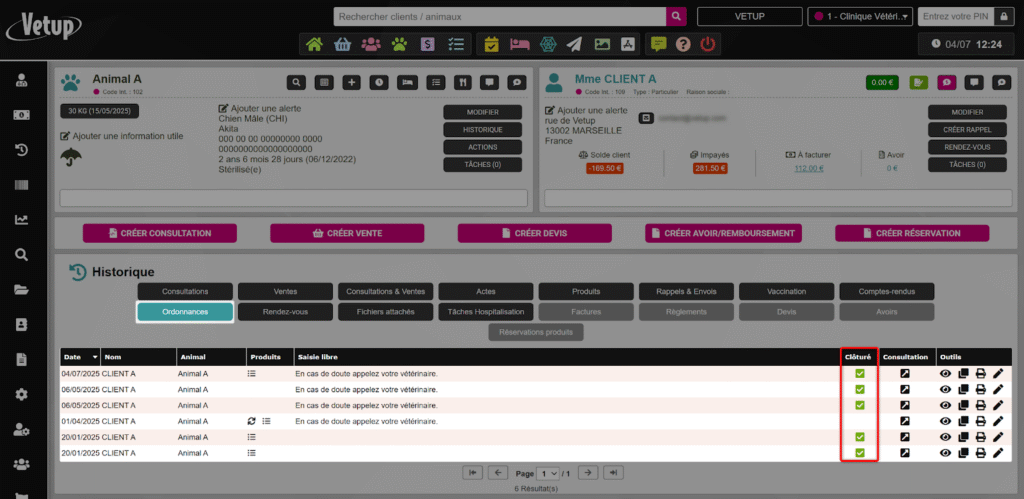 ⚠️ Il est important de noter que, pour des raisons légales de traçabilité, toute ordonnance transmise au client est automatiquement clôturée. Ainsi, les actions Imprimer ou Email au client déclenchent la clôture immédiate de l’ordonnance.