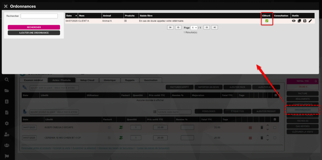 Les ordonnances clôturées sont identifiables grâce au symbole ✅ affiché dans la colonne “Clôturé” des différentes fenêtres du logiciel.