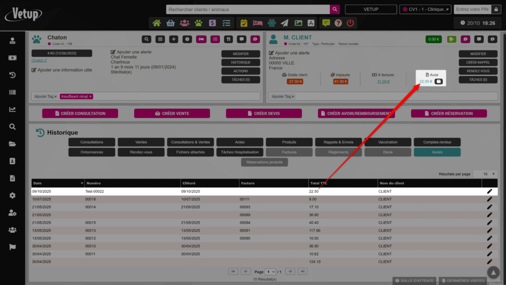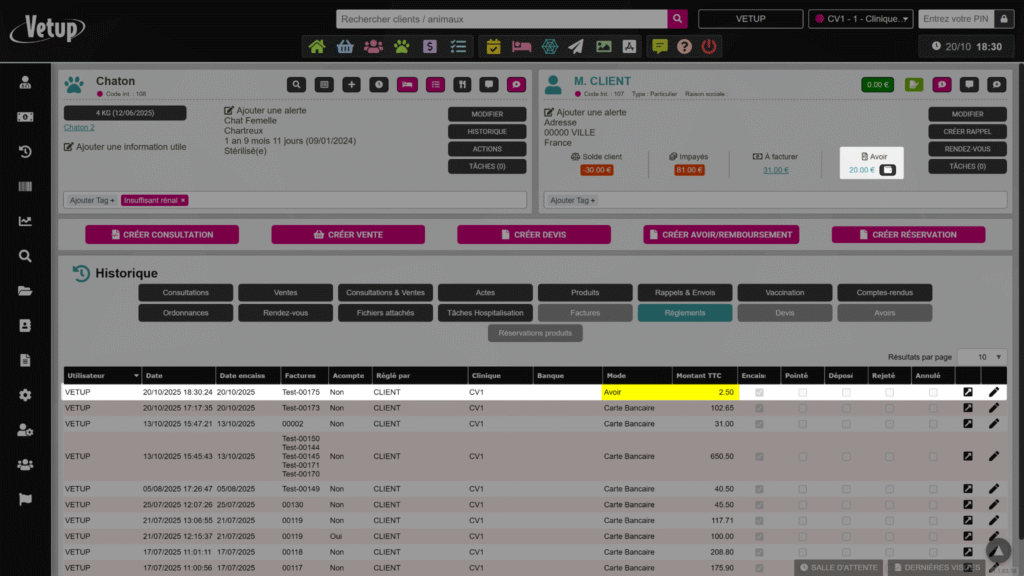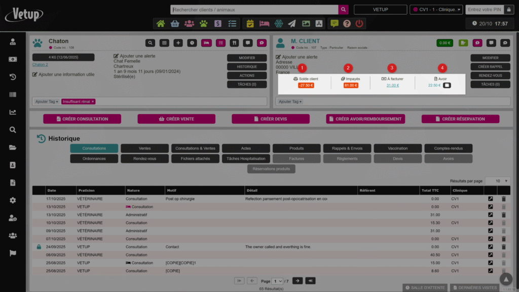 - Solde négatif (en rouge) → le client doit de l’argent à la clinique.