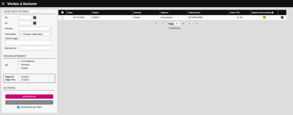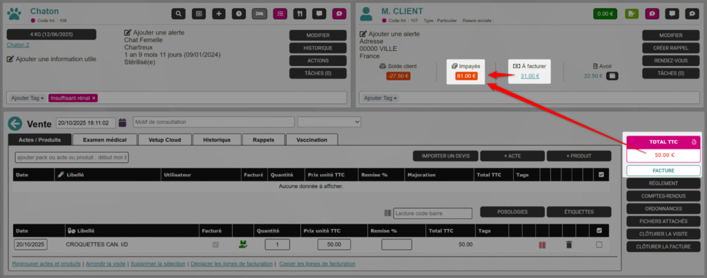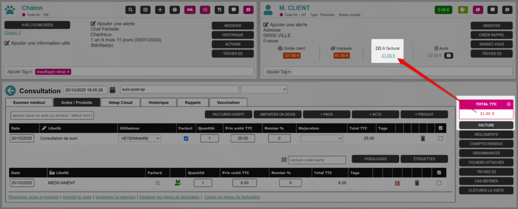 Vous y verrez les visites concernées : ici, une consultation à facturer de 31 € et une vente facturée mais impayée de 50 €.