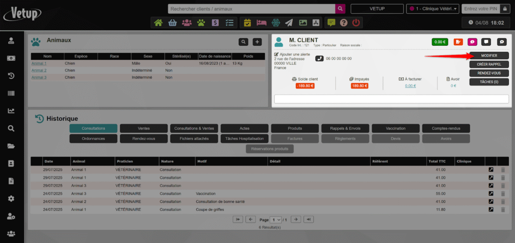 - Voir les détails d’une fiche client ou animal depuis la page de prise de rendez-vous