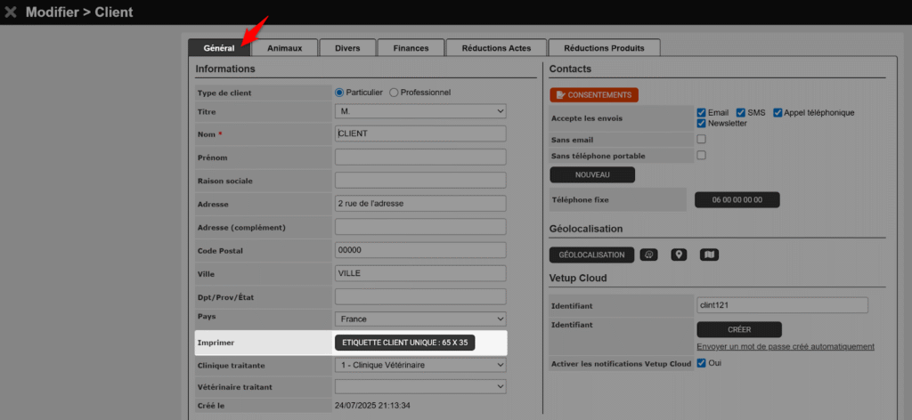 Depuis la fiche d’un client, en cliquant sur le bouton MODIFIER, vous trouverez l’option ÉTIQUETTE CLIENT UNIQUE dans l’onglet Général.