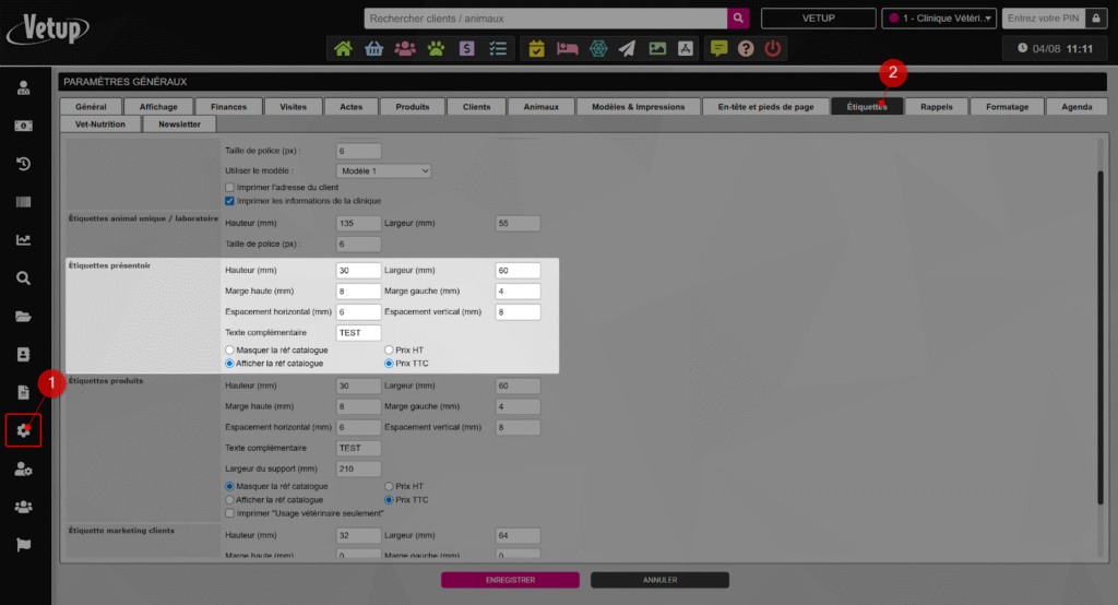 Vous pouvez configurer les étiquettes produits depuis le menu PARAMÈTRES > Paramètres généraux (1), via l’onglet Étiquettes (2).