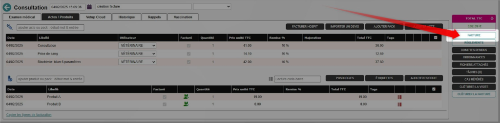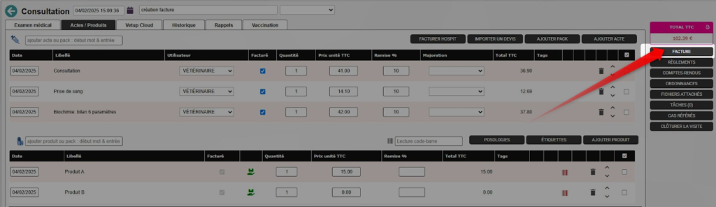 Lorsque vous avez terminé l’ajout de vos actes et produits dans la consultation, cliquez sur le bouton FACTURE.
