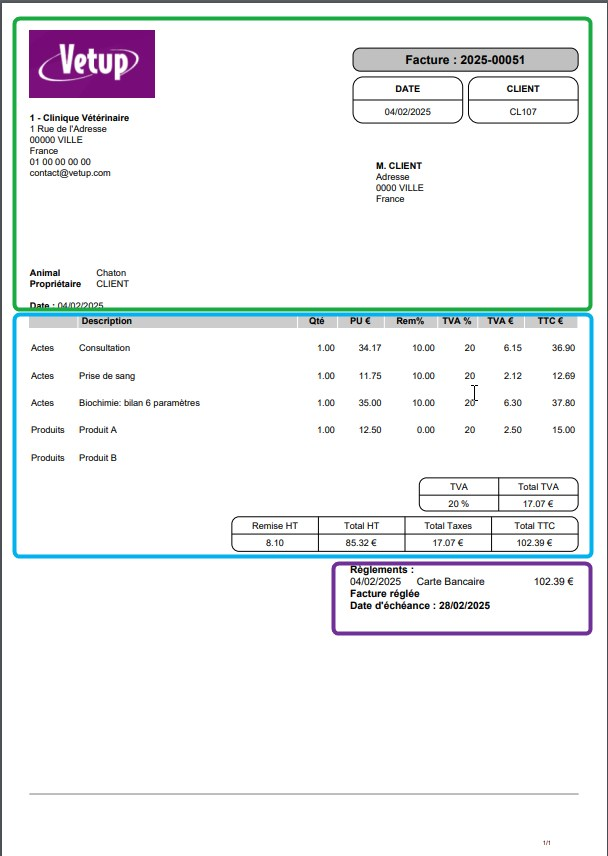 Une facture est un document officiel, généré lors de la facturation des actes et/ou produits vendus à un client lors d’une consultation ou d’une vente. Elle récapitule les services réalisés, les montants dus et reprend les modalités de paiement s’il y en a.