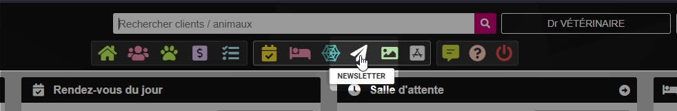 Depuis n’importe quelle page du logiciel, vous pouvez accéder au module NEWSLETTER en cliquant sur l’icône “avion en papier”, située sous la barre de recherche principale.