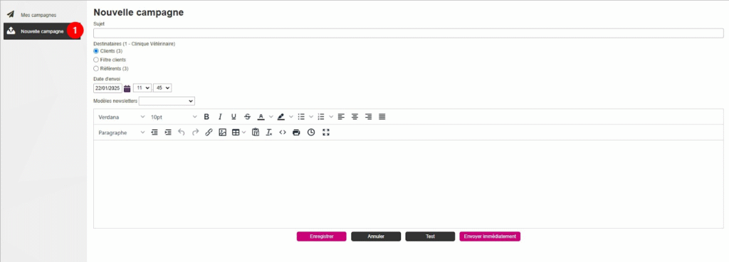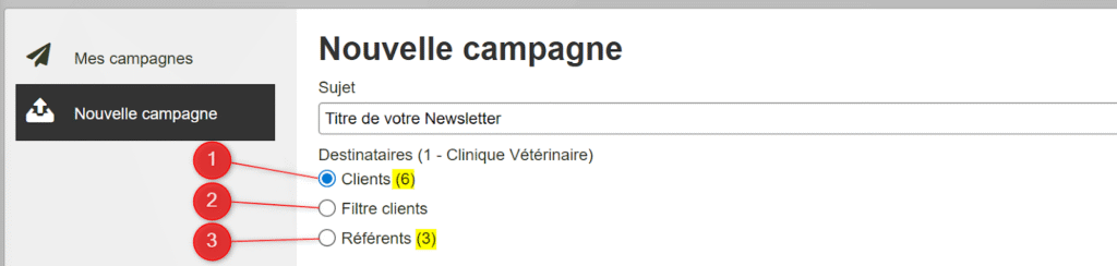 👀 Référez-vous au tutoriel dédié Utiliser les filtres clients pour vos newsletters. - Par Référents : ciblez les vétérinaires présents dans MEDICAL > Référés : Vétérinaires. Le nombre de confrères concernés par l’envoi est indiqué entre parenthèses.