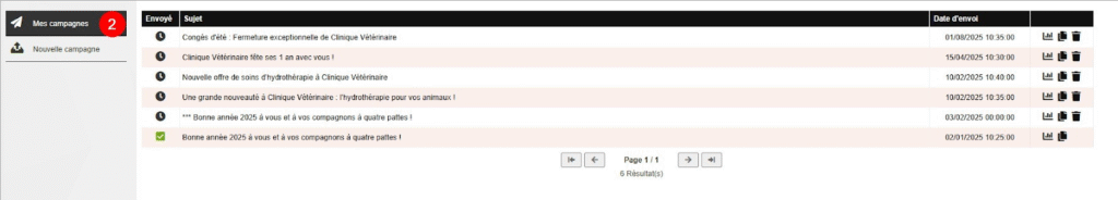 Dans la colonne Envoyé, identifiez d’un coup d’œil les campagnes déjà envoyées ✅ ou celles en attente 🕔, avec leurs sujets affichés.
