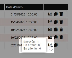 - Logo Statistiques : en survolant l’icône, une bulle d’information vous indique le nombre de mail Envoyés, En Erreur ou En attente.