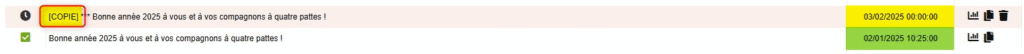 - Dupliquer : créez une copie exacte de la newsletter sélectionnée pour un envoi prévu un mois plus tard à partir de la date initiale du premier envoi. Vous pouvez double-cliquer pour ajuster les paramètres ou modifier le texte.