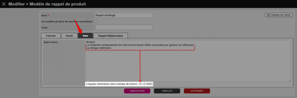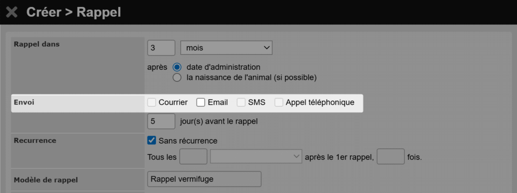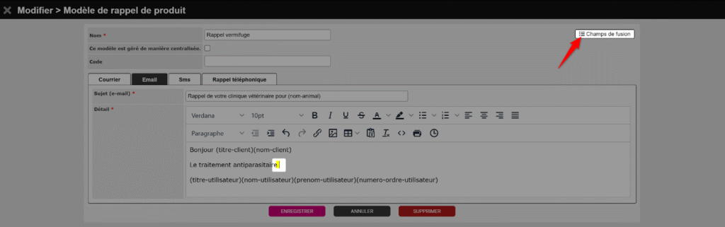 Pour pouvoir associer un rappel à un acte ou à un produit, vous devez au préalable créer un modèle de rappel. Ce modèle définit le contenu du message (mail, SMS, courrier), vous permettant de le personnaliser grâce aux champs de fusion.