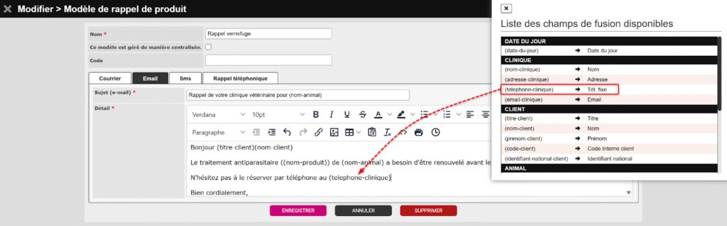 Les champs disponibles sont classés par thématique (informations client, clinique, animal). Leur disponibilité dépend du type de modèle que vous êtes en train d’éditer : pour un modèle de rappel d’acte, vous ne verrez pas les champs liés aux produits, et inversement.