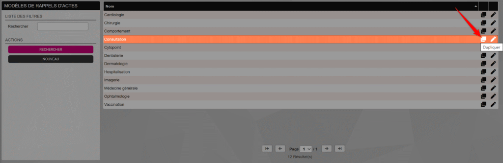 Par défaut, des modèles types sont déjà présents dans Modèles de rappels d’actes.