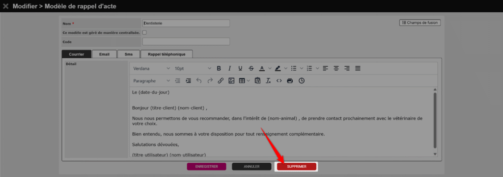 Pour supprimer un modèle de rappel (acte ou produit), cliquez sur la ligne ou sur l’icône stylo pour accéder à la fenêtre de modification, puis cliquez sur SUPPRIMER.
