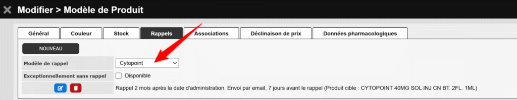 Pour modifier un modèle de rappel (acte ou produit), cliquez sur la ligne ou sur l’icône stylo au bout de la ligne afin d’ouvrir la fenêtre de modification. Apportez les ajustements souhaités.