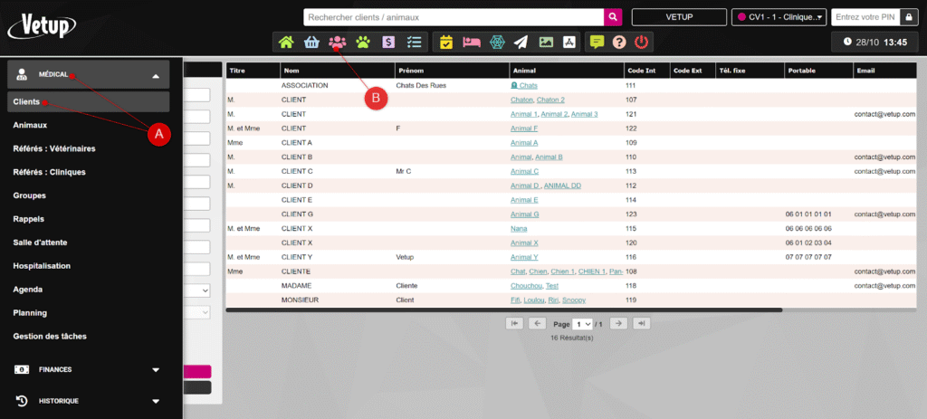 Rendez-vous dans le menu MEDICAL > Clients (A), soit depuis la barre latérale gauche, soit depuis le raccourci rose de la barre de raccourcis (B).