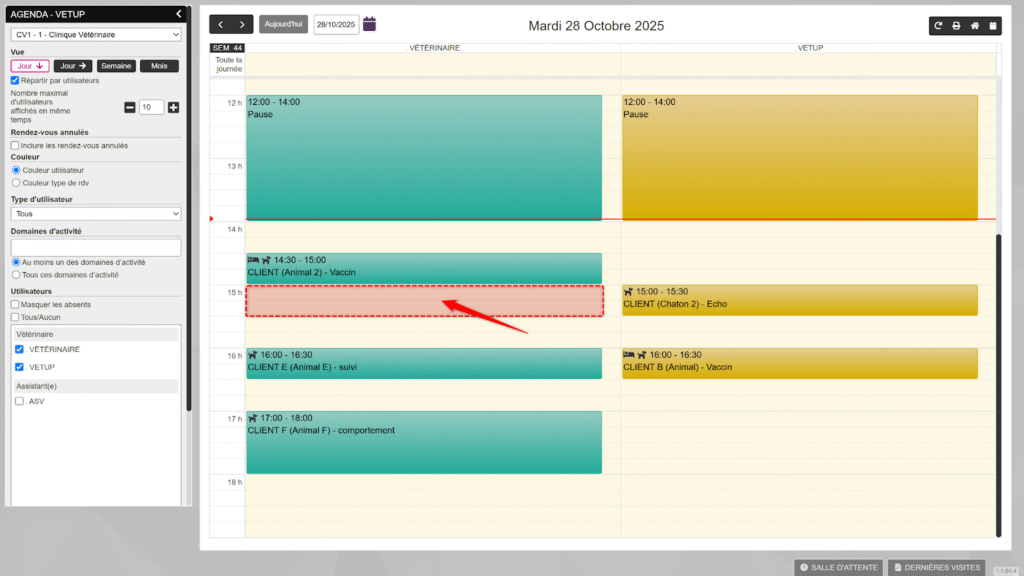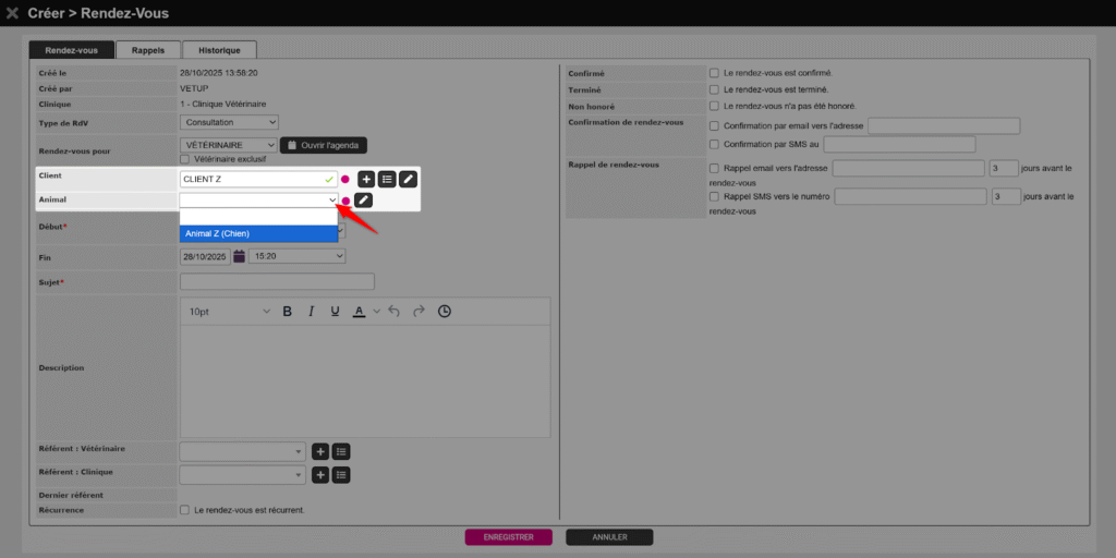 Le profil du client sera alors ajouté au créneau de rendez-vous. Sélectionnez son animal, puis continuez à remplir les autres éléments du rendez-vous (date, horaire, motif, rappels, etc.) pour l’ajouter à l’agenda.