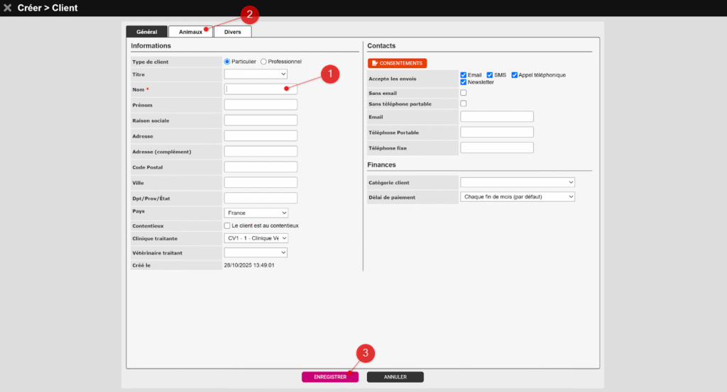 Cliquez sur Enregistrer (3) lorsque vous avez terminé de remplir les informations. Vous serez alors redirigé sur la fiche du client et de son animal, le cas échéant.