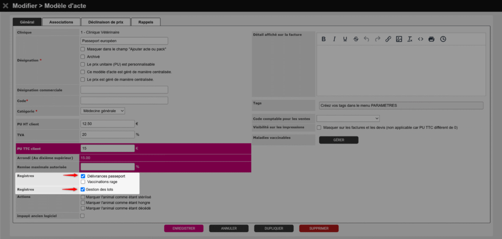 📌 Par défaut, un acte nommé Passeport européen est déjà présent dans votre compte Vetup. Vous pouvez modifier sa dénomination et son prix si besoin.