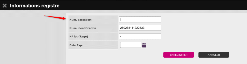 Dans la fenêtre qui s’affiche, saisissez le numéro de passeport dans le champ correspondant.