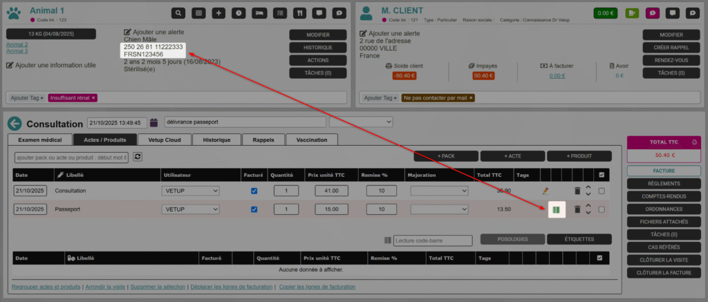 Lors d’une consultation, ajoutez votre acte Passeport dans la facturation.