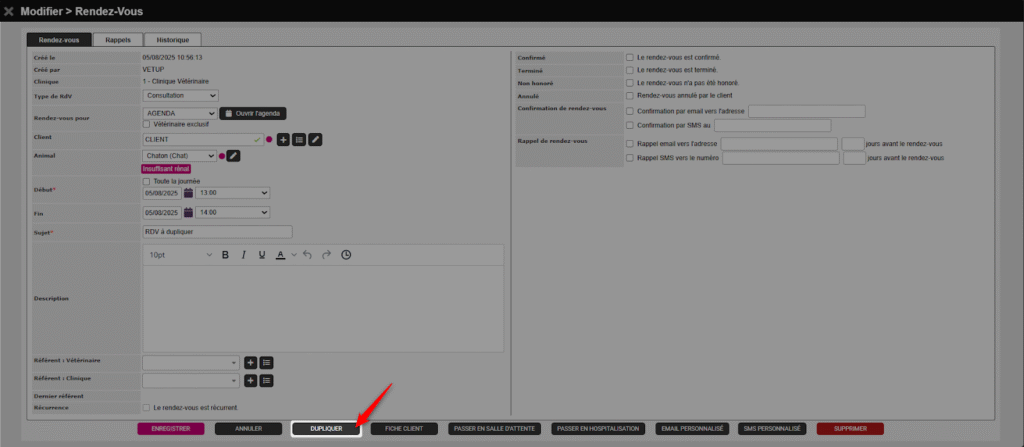 Si un propriétaire doit réserver plusieurs rendez-vous pour son animal, la fonction dupliquer vous permet de ne pas avoir à resaisir pour chaque rendez-vous le nom de propriétaire, de l’animal, ainsi que le motif de la visite.