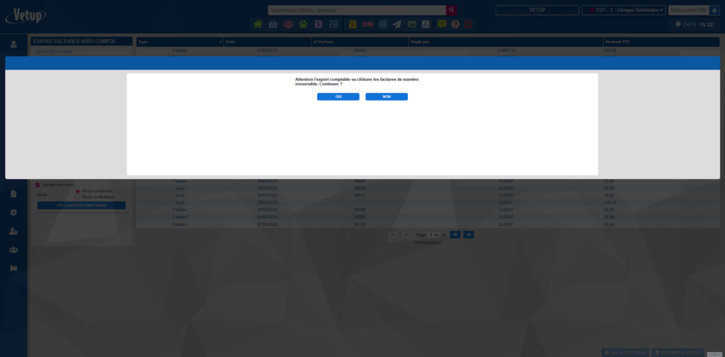 En fonction de votre paramétrage, un message va s’afficher vous indiquant que cette action clôturera les factures non clôturées de manière irréversible.