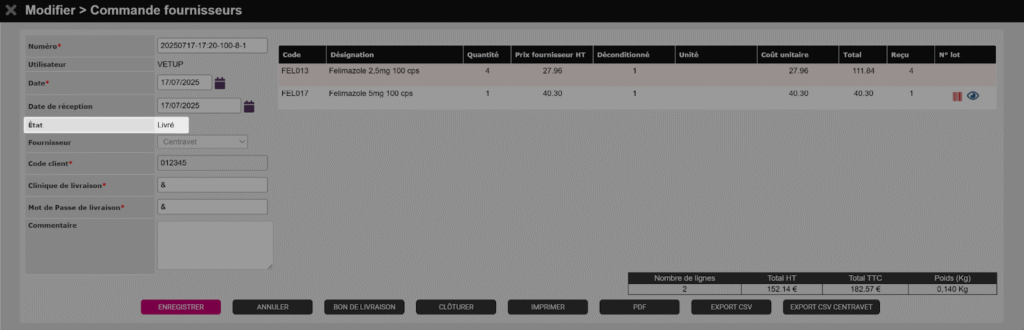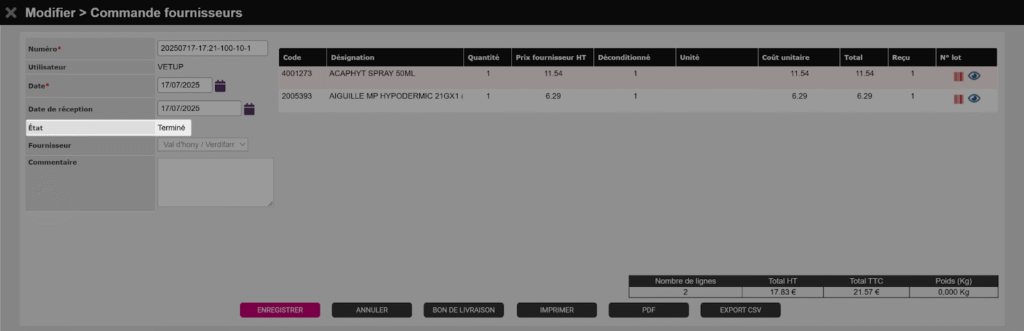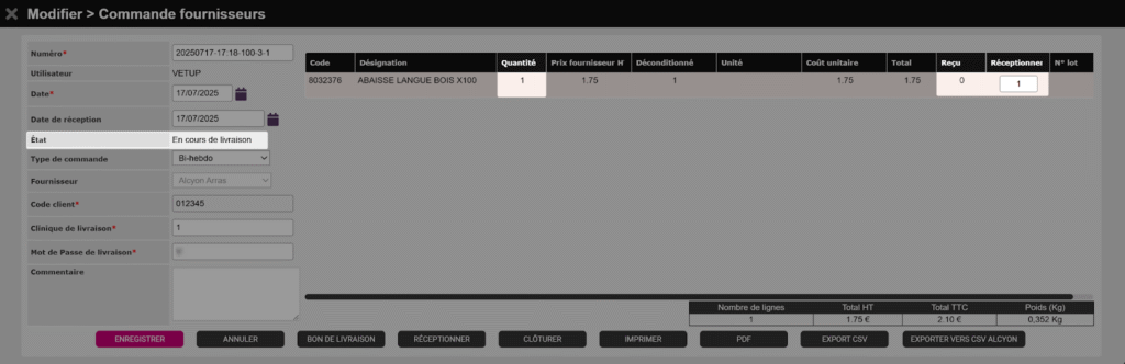 C’est le dernier état lié au passage de commande. L’étape suivante sera la réception de la commande. Les boutons liés à la réception deviennent alors disponibles.