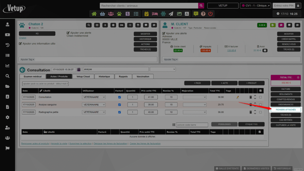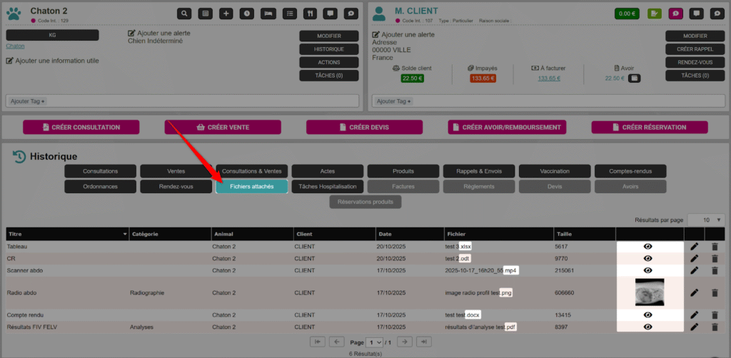 Dans la vue HISTORIQUE de la fiche client / animal, en cliquant sur Fichiers attachés, la présentation est légèrement différente :