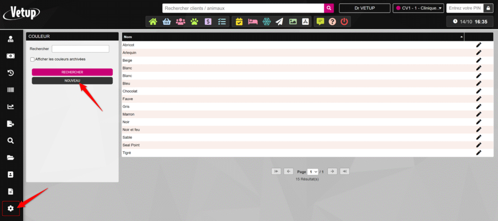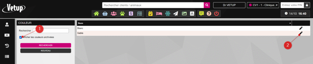 Pour archiver une couleur, rendez-vous dans le menu PARAMÈTRES > Couleurs animales, recherchez la couleur à archiver grâce à la barre de recherche (1), puis cliquez sur l’icône en forme de crayon (2) au bout de la ligne correspondante.