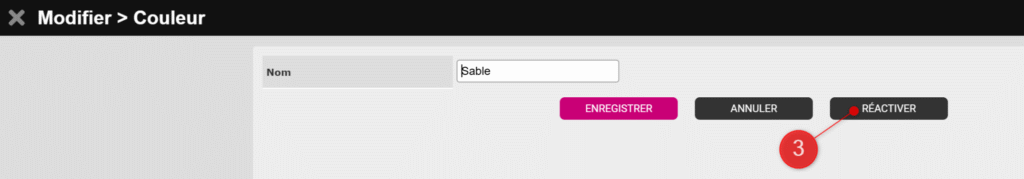 Dans la fenêtre qui s’ouvre, cliquez sur Réactiver (3). La couleur sera alors réintégrée à votre liste de couleurs actives.