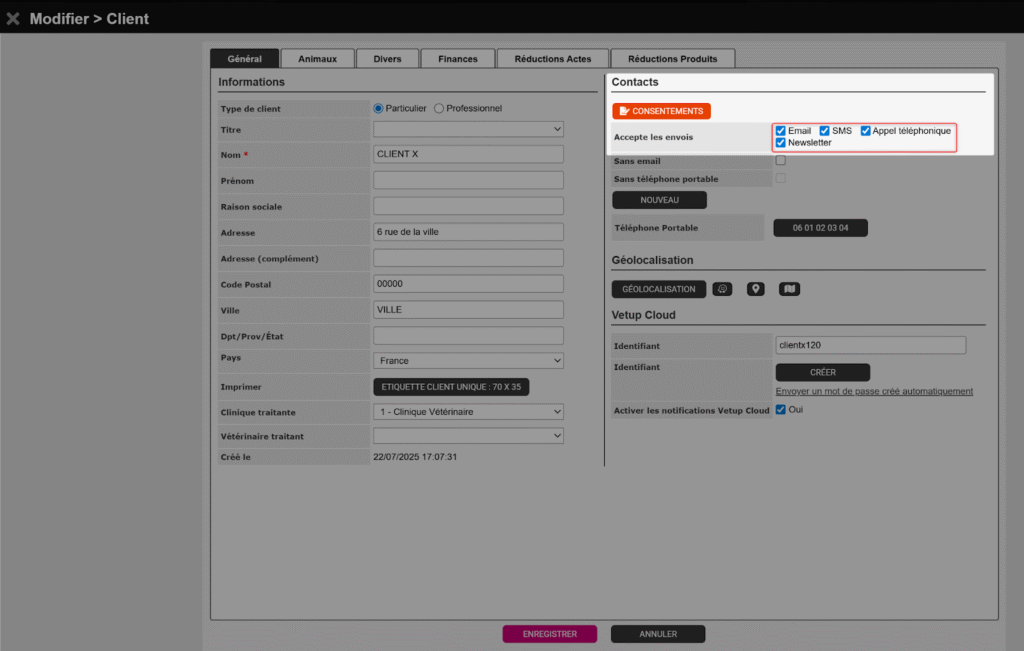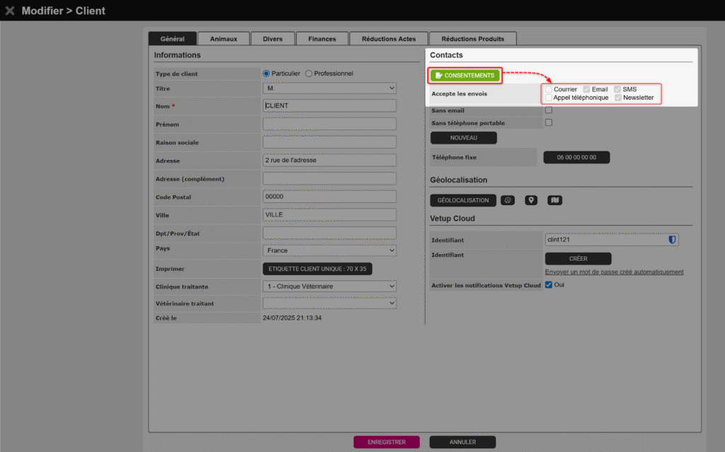 La section Accepte les envois, accessible depuis la fiche client (bouton MODIFIER), permet d’indiquer quels canaux de communication le client autorise pour recevoir des messages émis depuis Vetup.