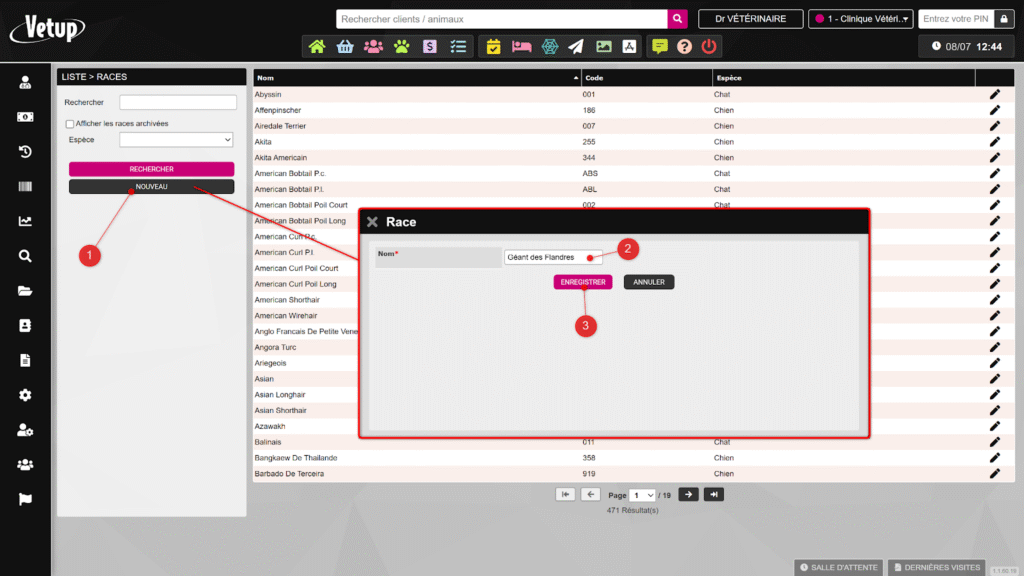 Cliquez sur le bouton Nouveau (1), renseignez le nom de la race (2), puis cliquez sur Enregistrer (3).