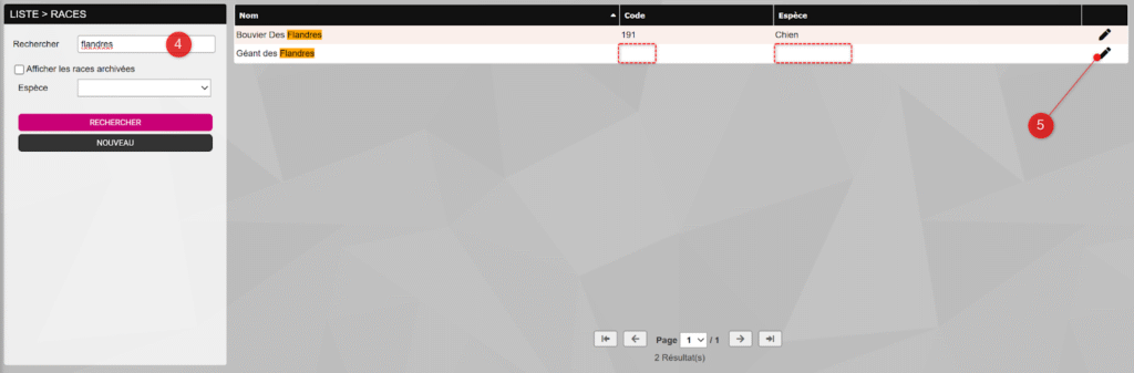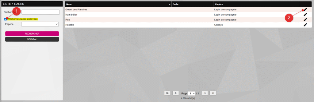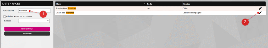 Rendez-vous dans le menu PARAMÈTRES > Races animales, recherchez la race à archiver grâce à la barre de recherche (1), puis cliquez sur l’icône en forme de crayon (2) au bout de la ligne correspondante.