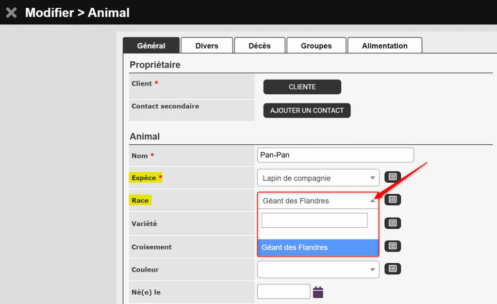 Comme vous avez associé la race à une espèce, la liste déroulante vous proposera uniquement les races correspondant à l’espèce sélectionnée.