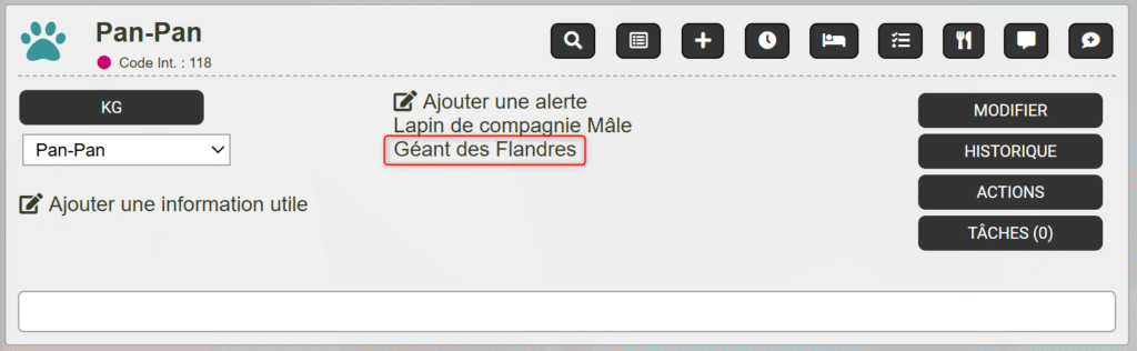 Sur la fiche d’un animal, la race est affichée au centre de cette façon.