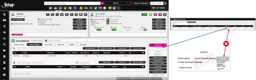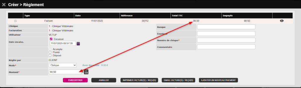 90.50€ ont été encaissés en carte bancaire ou en chèque alors que la facture est de 99.50€.