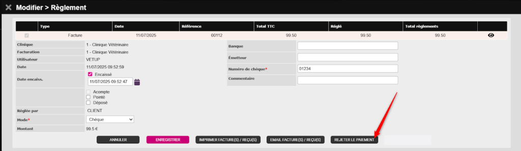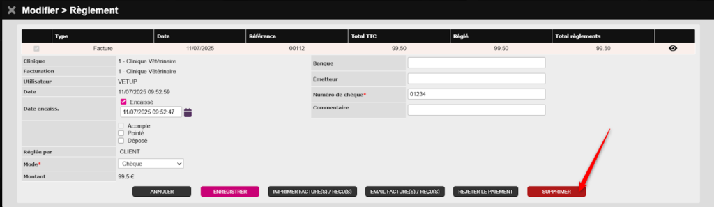 Depuis la consultation initiale (où l’erreur à été commise), cliquez sur l’onglet RÈGLEMENTS afin de REJETER le règlement de 99,50€ enregistré.