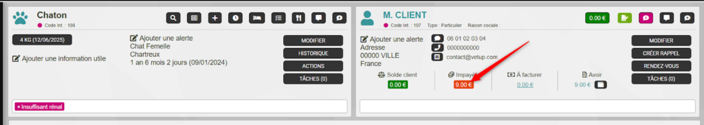 Un impayé de 9€ sera alors présent sur la fiche du client, cet impayé sera dû pour la prochaine fois où ce propriétaire amènera un de ses animaux en consultation.