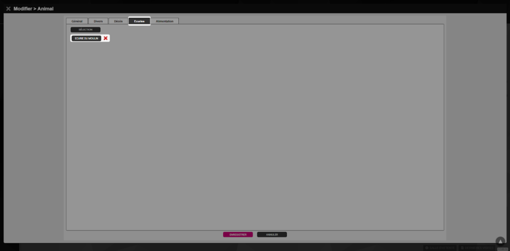 Depuis la fiche de l’animal concerné > MODIFIER > “Ecuries”, “Groupes” , vous pouvez visualiser cette information et la modifier si besoin.