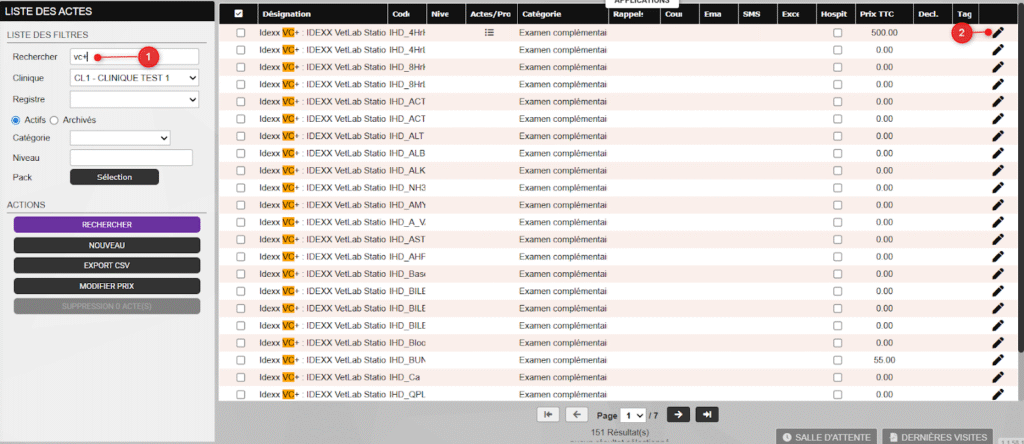 Indiquez le mot VC+ dans la barre de recherche afin de visualiser uniquement les actes VC+, puis cliquez sur l’icône en forme de crayon au bout de la ligne pour enregistrer votre prix.