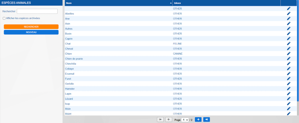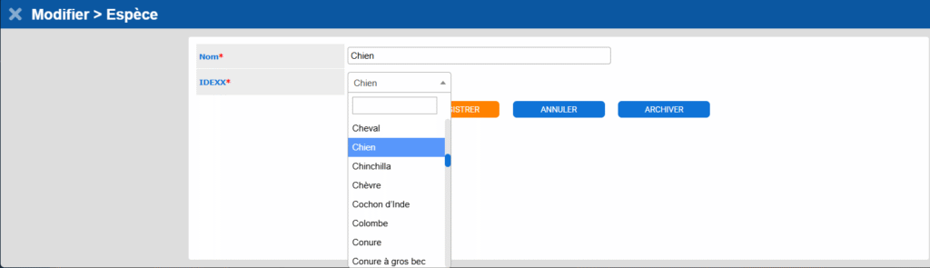 Dans le menu Paramètres > Espèces animales, afficher la liste des espèces. Vous verrez la liste des espèces avec le code Idexx correspondant.