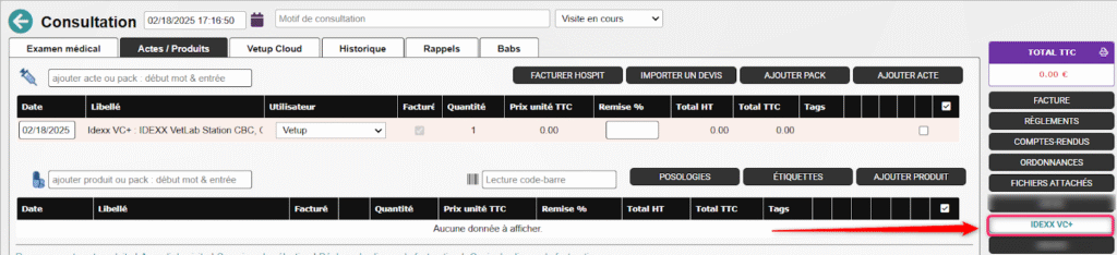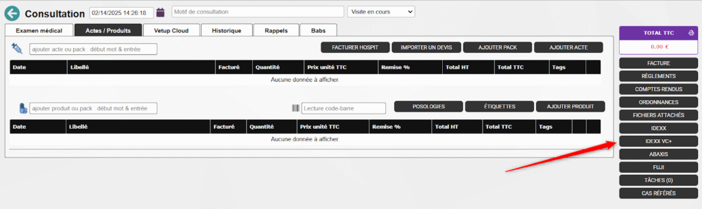 1. Cliquez sur le bouton IDEXX VC+ depuis la consultation/visite concernée.