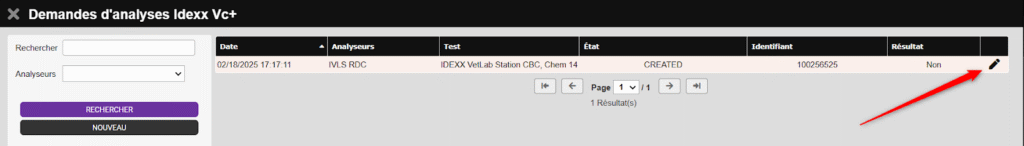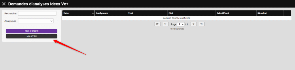 Une page s’ouvre, cliquez sur le bouton NOUVEAU. Cela affichera la liste des demandes d’analyses IDEXX VC+.