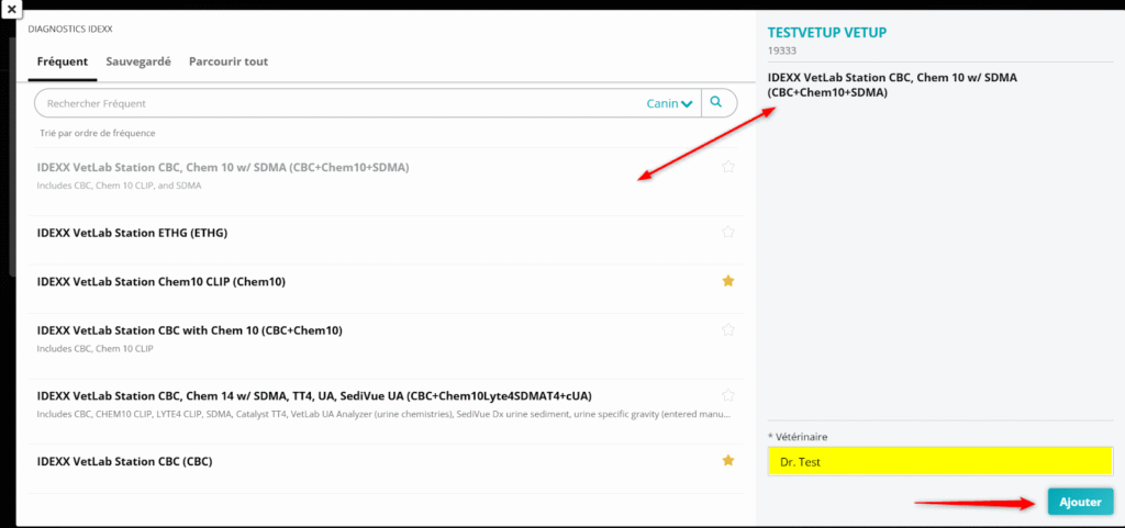 Une fenêtre s’ouvre sur la page Idexx, affichant tous les types d’analyses disponibles.