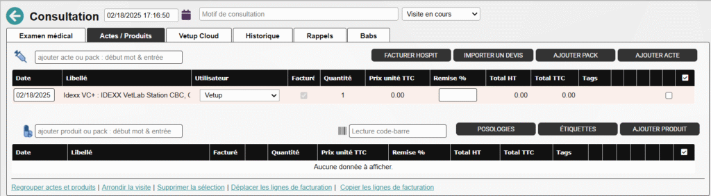 Pour réaliser une demande d’analyse, il convient de créer une consultation, puis de cliquer sur le bouton IDEXX VC+.