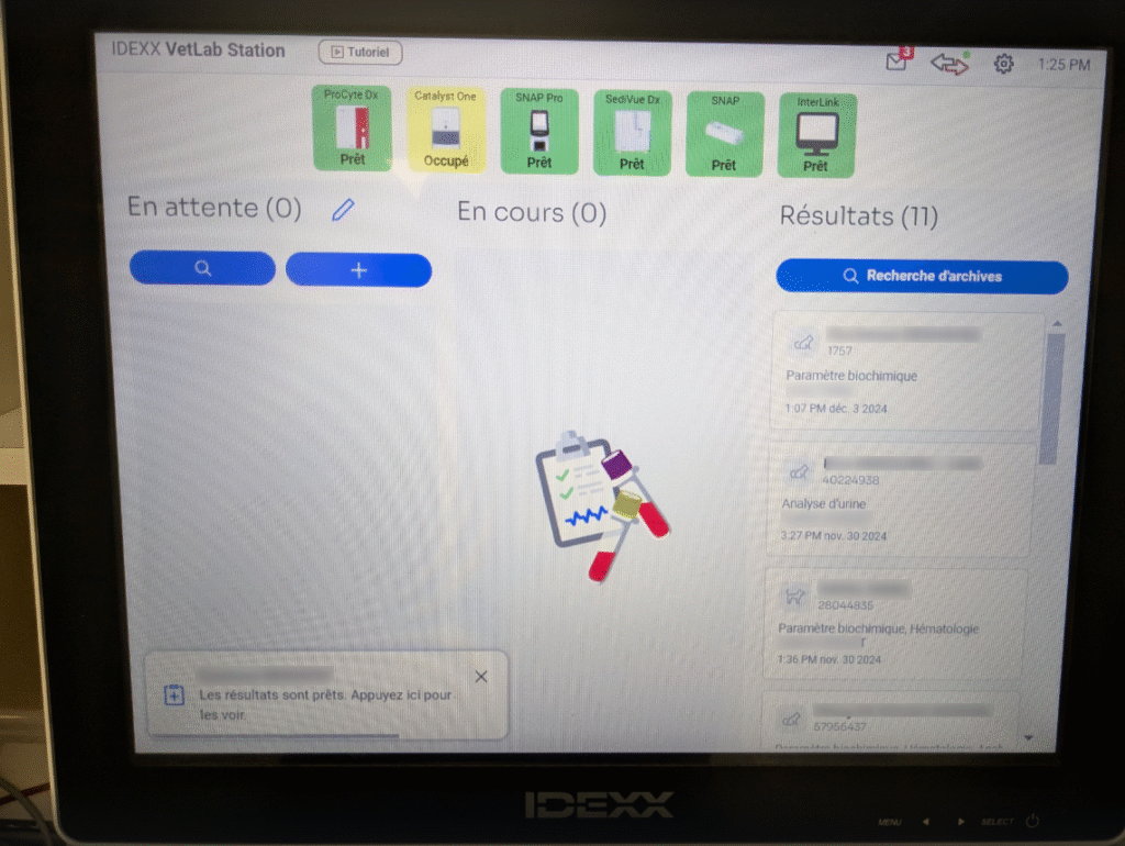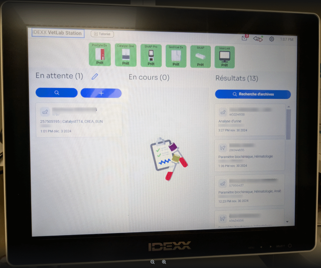 Sur votre Vetlab, la demande d’analyse s’affiche dans la colonne de gauche « En attente« , indiquant le nombre d’analyses à réaliser (ici, 1).