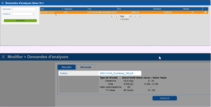Les résultats d’analyse (PDF) remontent automatiquement en tant que fichier attaché dans la consultation où la demande a été effectuée.